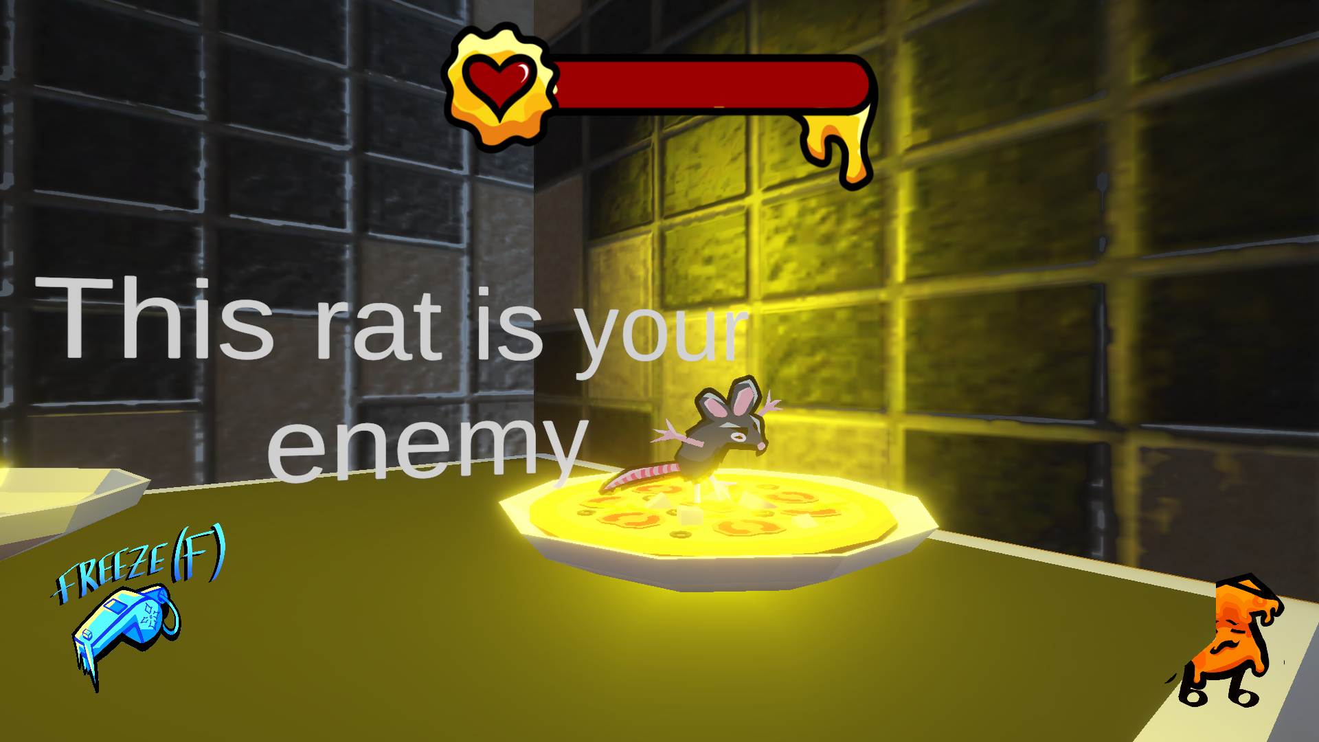 You play as a manic, sentient piece of cheese with one burning desire: to melt onto a delicious Italian pizza! But it won't be easy — hungry rats are out to devour you. Reach the pizza and achieve your melty destiny by dodging the rodents and using your trusty whistle to freeze them in their tracks!